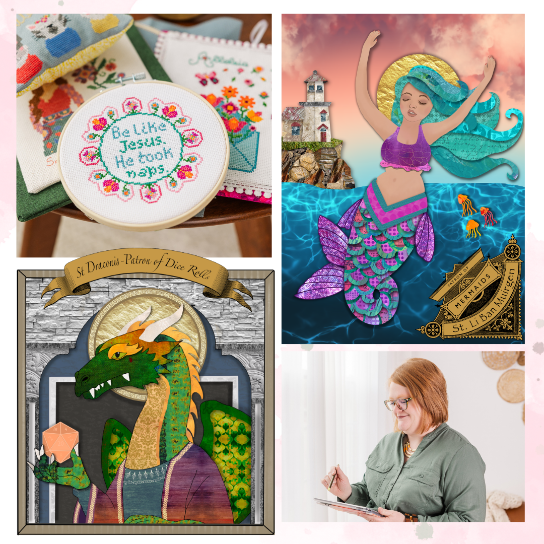I create mixed media art, digital designs, and crafting kits inspired by saints, meaningful stories, and the beautifully strange edges of spirituality and imagination. You’ll find eclectic and eccentric figures, a touch of humor, and a bit of playful mischief.