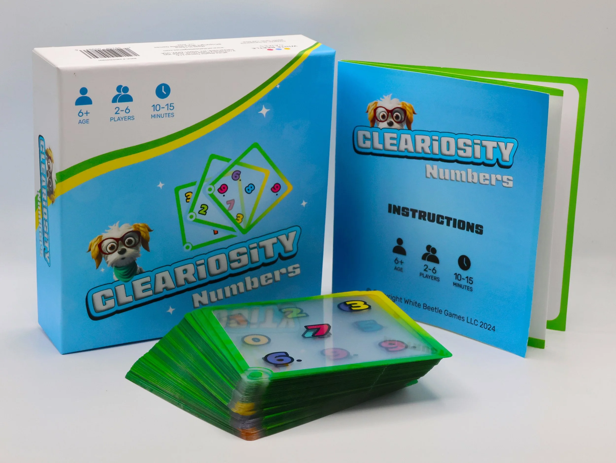 Cleariostiy Numbers is a fun, quick pace games, where players race to create simple equations by stacking clear plastic cards on top of each other. Intuitive rules take seconds to understand and minutes to master. The game is designed to fit children learning mathematical operations, and players can choose between playing ‘all four operations mode’ or just some of them to fit their math level. Ages 6+, 2-6 players, 10-15 minutes.