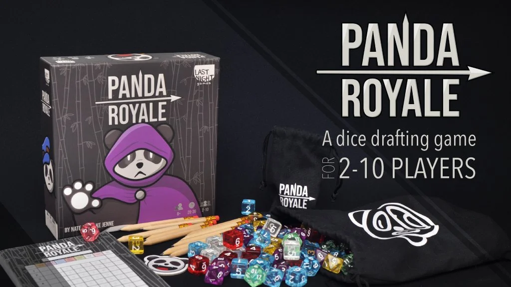 Panda Royale is an energetic dice game for 2-10 players. Each players roll dice over the course of 10 rounds, accumulating new dice each round. Each color of die is added or multiplied in unique ways to determine your score.